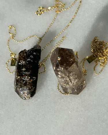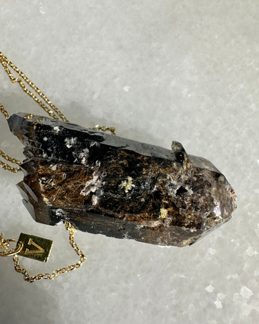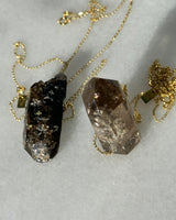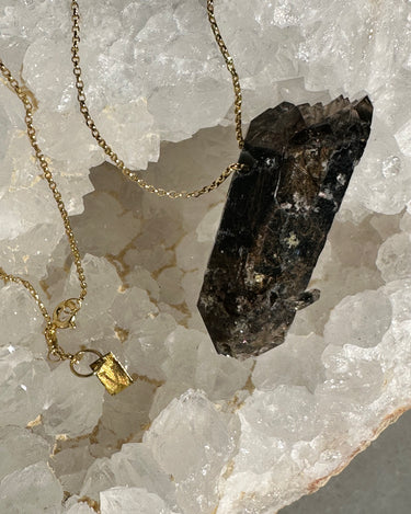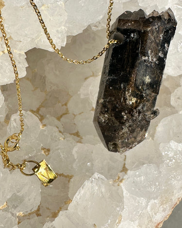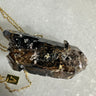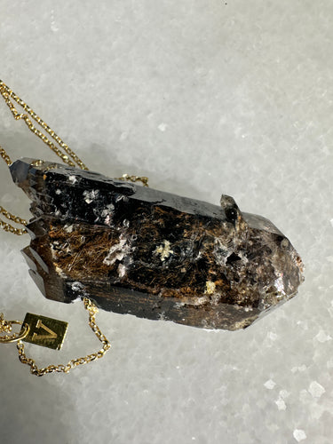 Self-healing smoked quartz from Malawi with Riebeckita inclusions and golden Aegirina set on a gold plated silver chain.